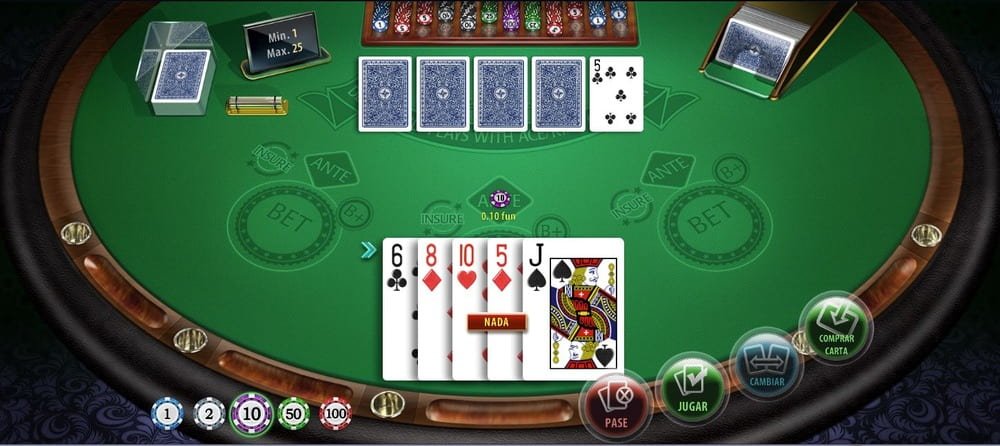 Debes superar la mano del crupier. El reto es no pasarte de 21. Recibes dos cartas y puedes elegir entre “pedir otra carta” y “plantarte” (mantener tu mano). También puedes doblar tu apuesta o dividir parejas si lo deseas.